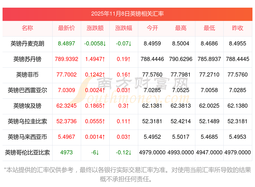 2025年11月8日最新消息,英鎊兌換緬幣最新匯率為2765.390000,今開為2758.7700,昨收為2758.7700,最高為2766.8600,最低為2749.8500。