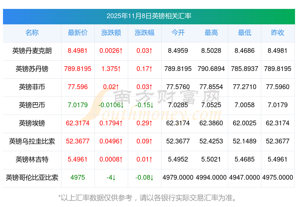 2025年11月8日最新消息,英鎊兌換民比最新匯率為31.586400,今開為31.5288,昨收為31.5864,最高為31.6212,最低為31.4268。