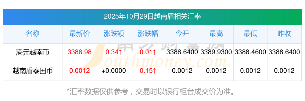 2025年10月29日最新消息,越南盾兌換泰國(guó)幣最新匯率為0.001230,今開(kāi)為0.0012,昨收為0.0012,最高為0.0012,最低為0.0012。