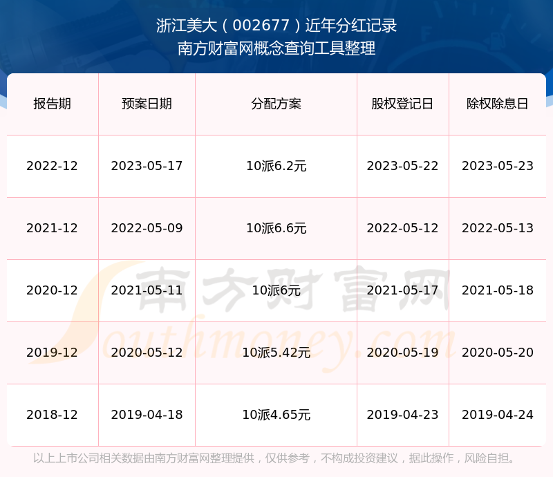 浙江美大最新一次公布的分紅方案為10派6.2元。本次權(quán)益分派股權(quán)登記日為2023年5月22日,除權(quán)除息日為2023年5月23日,派息日為2023年5月23日。