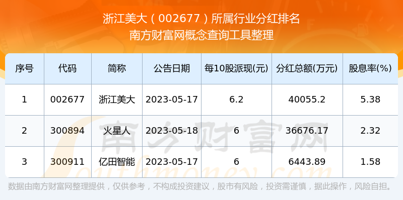 按照南方財富網(wǎng)趨勢選股系統(tǒng)統(tǒng)計,浙江美大所屬行業(yè)為集成灶行業(yè),集成灶行業(yè)分紅排名情況如下表: