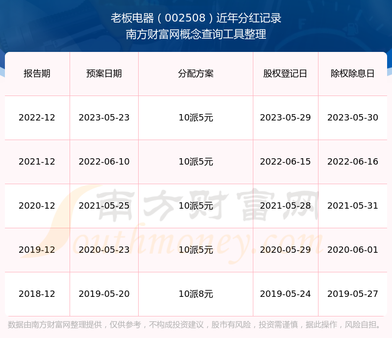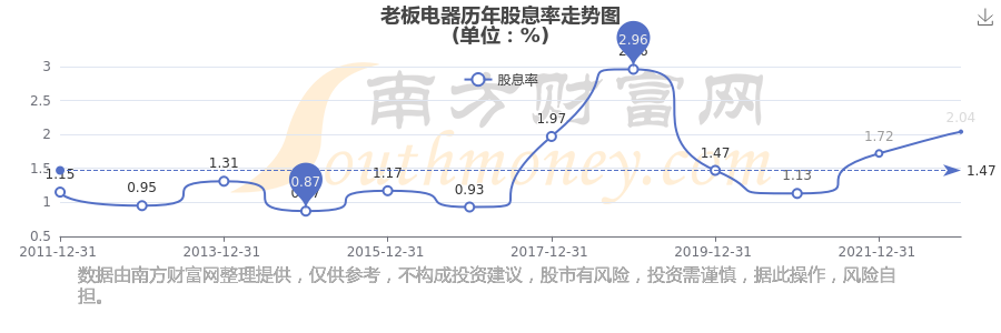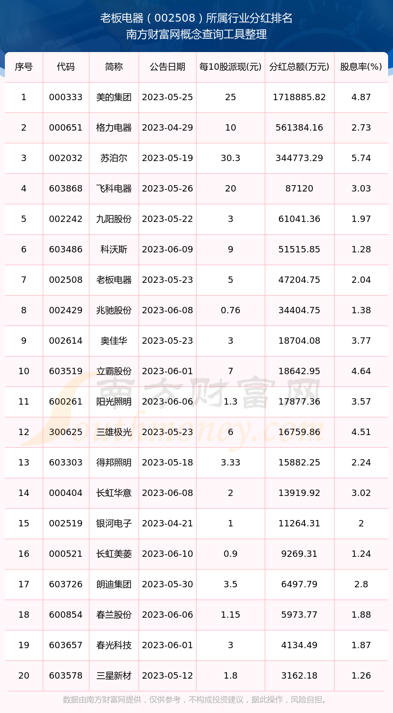 按照南方財(cái)富網(wǎng)趨勢(shì)選股系統(tǒng)統(tǒng)計(jì),老板電器所屬行業(yè)為吸油煙機(jī)行業(yè),吸油煙機(jī)行業(yè)分紅排名情況如下表:
