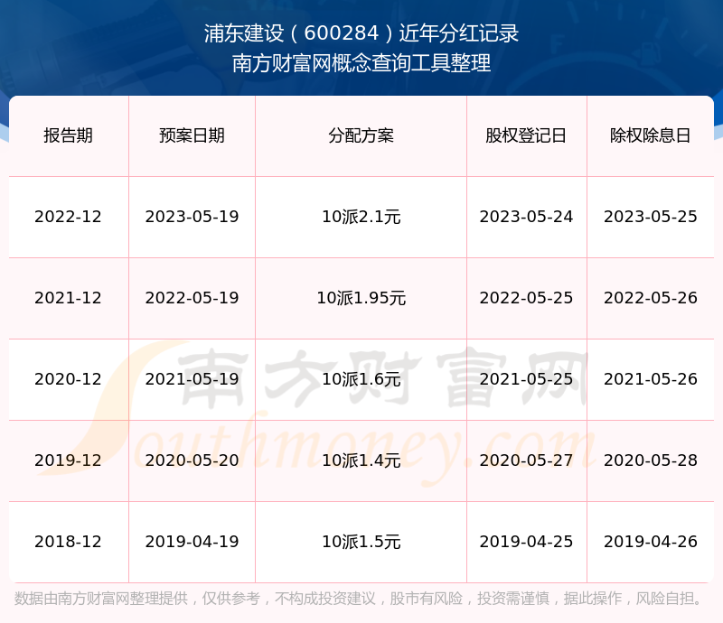 浦東建設(shè)最新一次公布的分紅方案為10派2.1元。本次權(quán)益分派股權(quán)登記日為2023年5月24日,除權(quán)除息日為2023年5月25日,派息日為2023年5月25日。