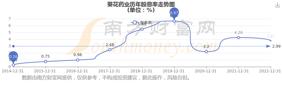 近年葵花藥業(yè)年度股息率走勢如下圖: