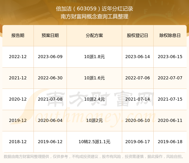 倍加潔最新一次公布的分紅方案為10派1.8元。本次權益分派股權登記日為2023年6月14日,除權除息日為2023年6月15日,派息日為2023年6月15日。