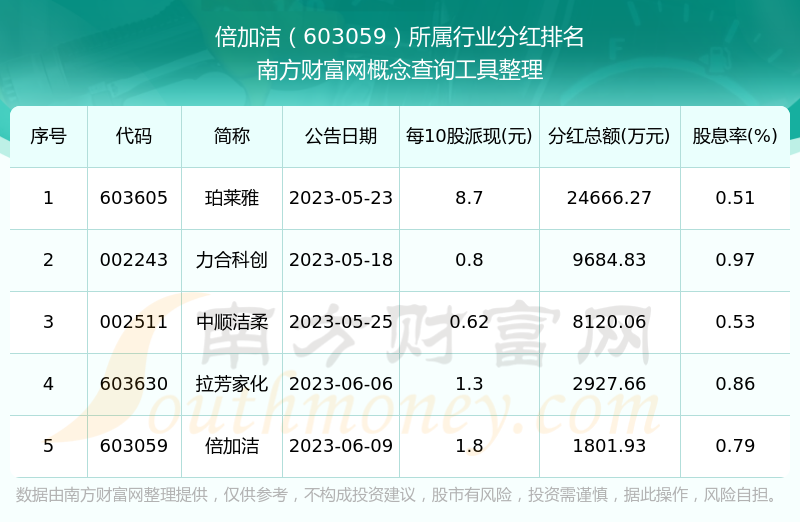按照南方財富網(wǎng)趨勢選股系統(tǒng)統(tǒng)計,倍加潔所屬行業(yè)為牙刷行業(yè),牙刷行業(yè)分紅排名情況如下表: