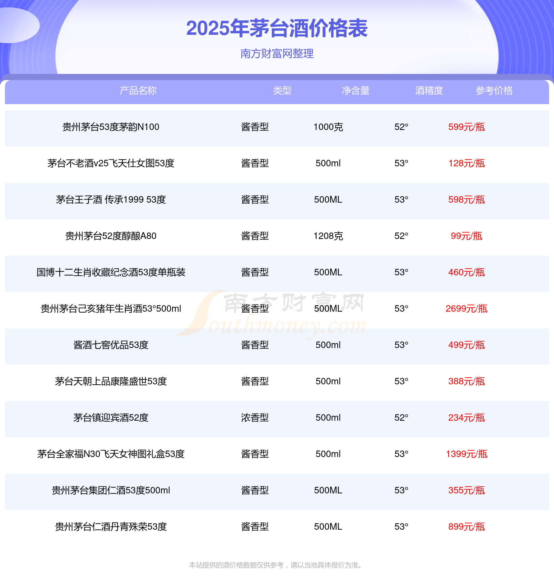 茅臺酒價格表2025一覽(多少錢一瓶)