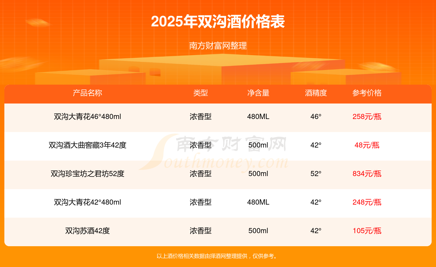 雙溝酒最新價(jià)格2025:雙溝珍寶坊之君坊52度參考價(jià)834元/瓶、雙溝大青花46°480ml參考價(jià)258元/瓶、雙溝大青花42°480ml參考價(jià)248元/瓶、雙溝蘇酒42度參考價(jià)105元/瓶、雙溝酒大曲窖藏3年42度參考價(jià)48元/瓶。