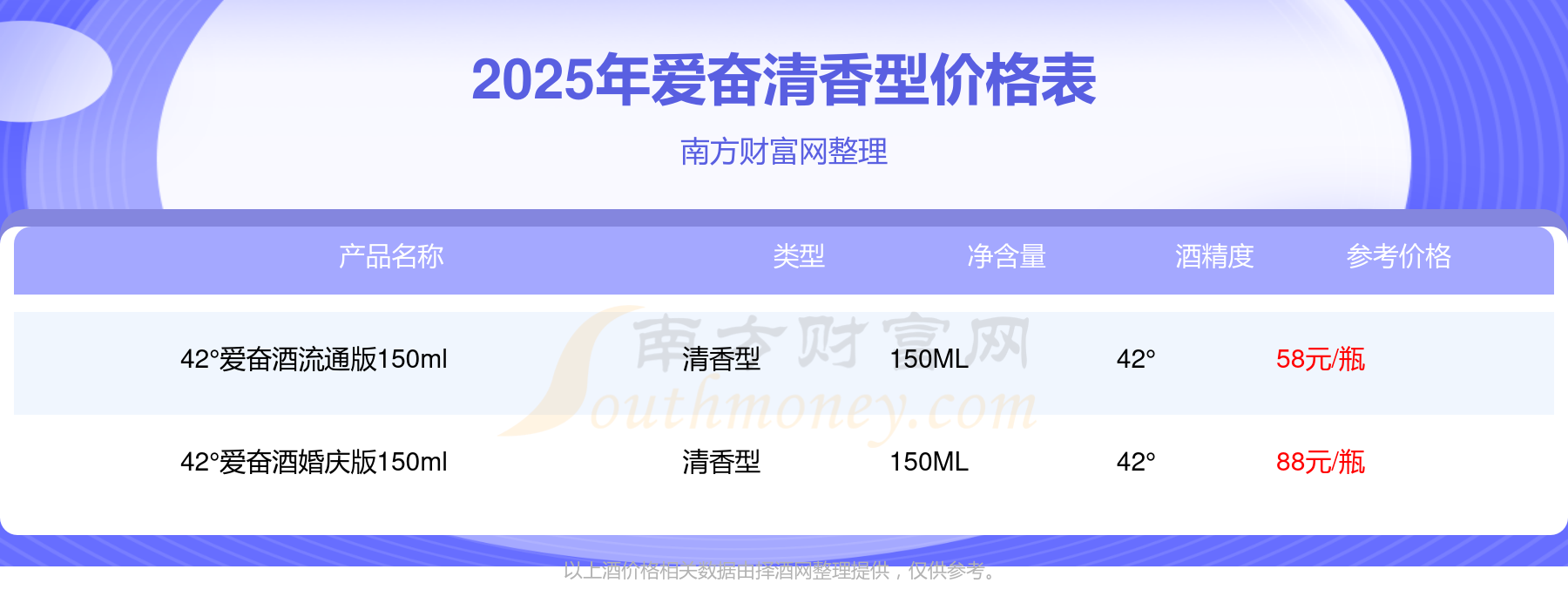 42°愛奮酒婚慶版150ml參考價(jià)88元/瓶、42°愛奮酒流通版150ml參考價(jià)58元/瓶。