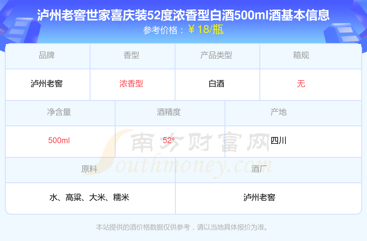 瀘州老窖世家喜慶裝52度濃香型白酒500ml基本信息