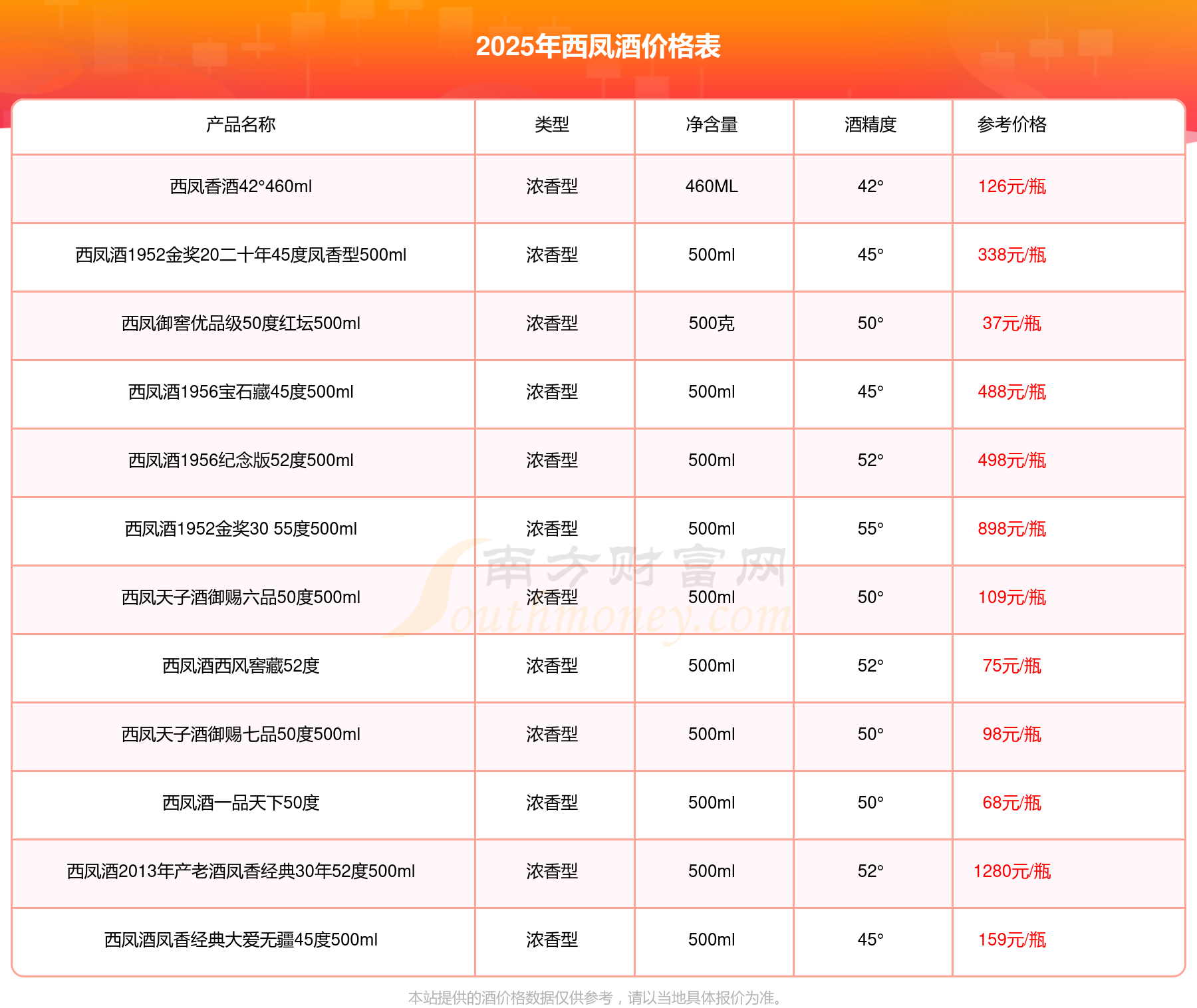 西鳳酒 酒海私藏55度3000ml參考價(jià)8880元/瓶、西鳳酒1952金獎(jiǎng)50 55度500ml參考價(jià)2380元/瓶、西鳳酒2013年產(chǎn)老酒鳳香經(jīng)典30年52度500ml參考價(jià)1280元/瓶、西鳳酒1956鉆石藏45度500ml參考價(jià)980元/瓶、西鳳酒1952金獎(jiǎng)30 55度500ml參考價(jià)898元/瓶、西鳳酒鳳香經(jīng)典20年52度500ml參考價(jià)768元/瓶、西鳳酒1952金獎(jiǎng)30 45度500ml參考價(jià)658元/瓶。