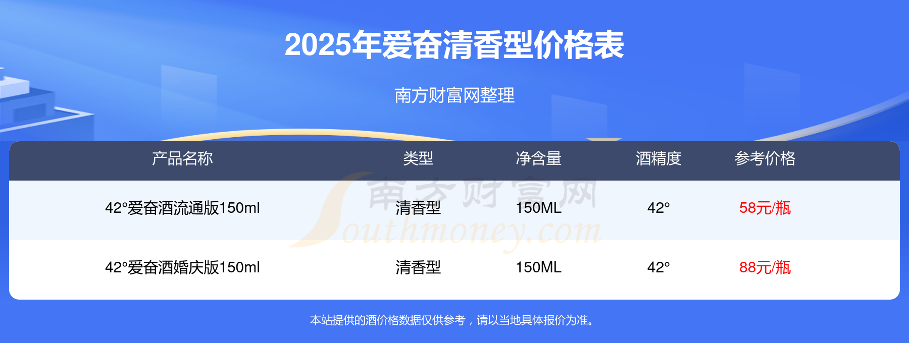42°愛奮酒婚慶版150ml參考價(jià)88元/瓶、42°愛奮酒流通版150ml參考價(jià)58元/瓶。