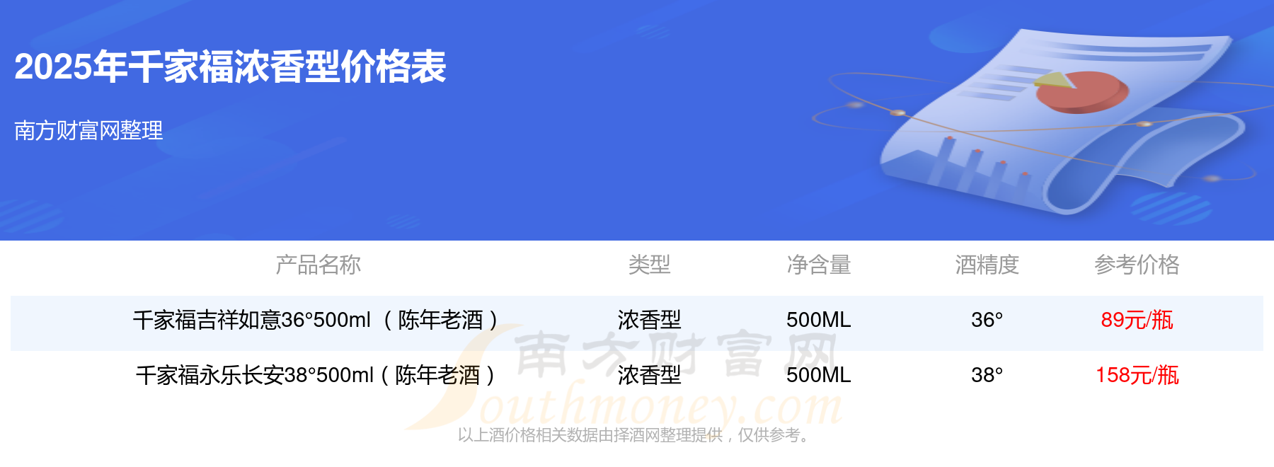 2025千家福濃香型酒最新價格:千家福永樂長安38°500ml(陳年老酒)參考價158元/瓶、千家福吉祥如意36°500ml (陳年老酒)參考價89元/瓶。