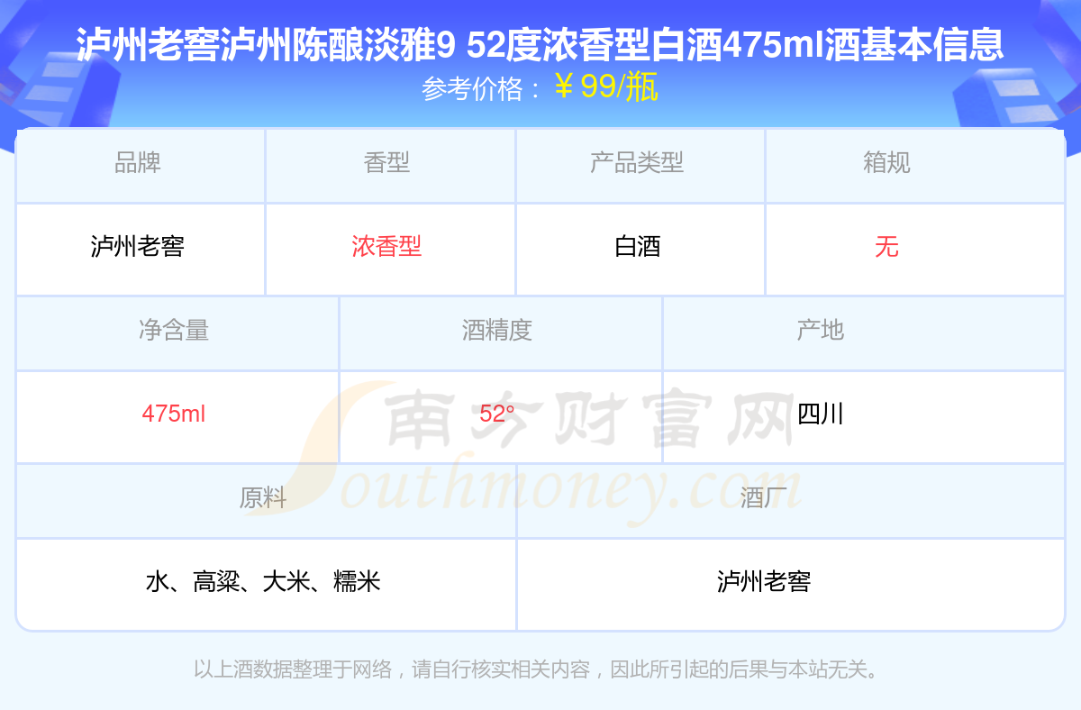 瀘州老窖瀘州陳釀淡雅9 52度濃香型白酒475ml基本信息