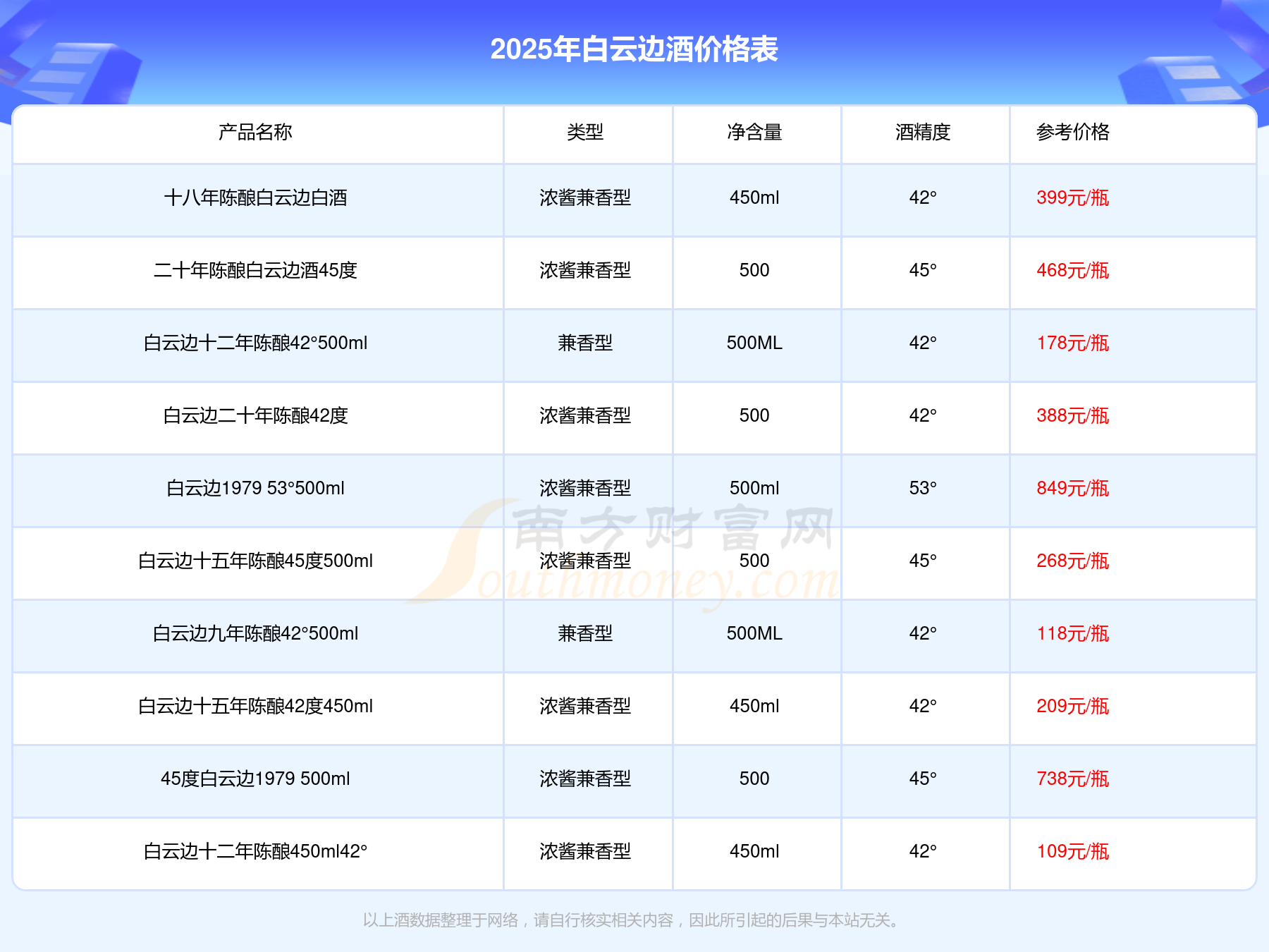 白云邊1979 53°500ml參考價849元/瓶、45度白云邊1979 500ml參考價738元/瓶、二十年陳釀白云邊酒45度參考價468元/瓶、十八年陳釀白云邊白酒參考價399元/瓶。