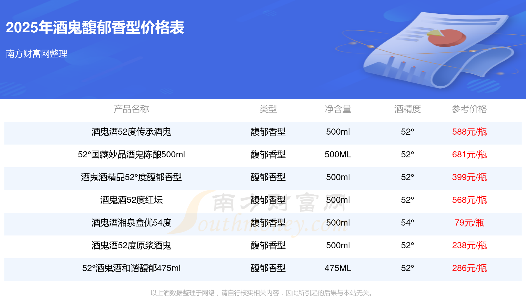 52°國藏妙品酒鬼陳釀500ml參考價681元/瓶、酒鬼酒52度傳承酒鬼參考價588元/瓶、酒鬼酒52度紅壇參考價568元/瓶、酒鬼酒精品52°度馥郁香型參考價399元/瓶、52°酒鬼酒和諧馥郁475ml參考價286元/瓶、酒鬼酒52度原漿酒鬼參考價238元/瓶。