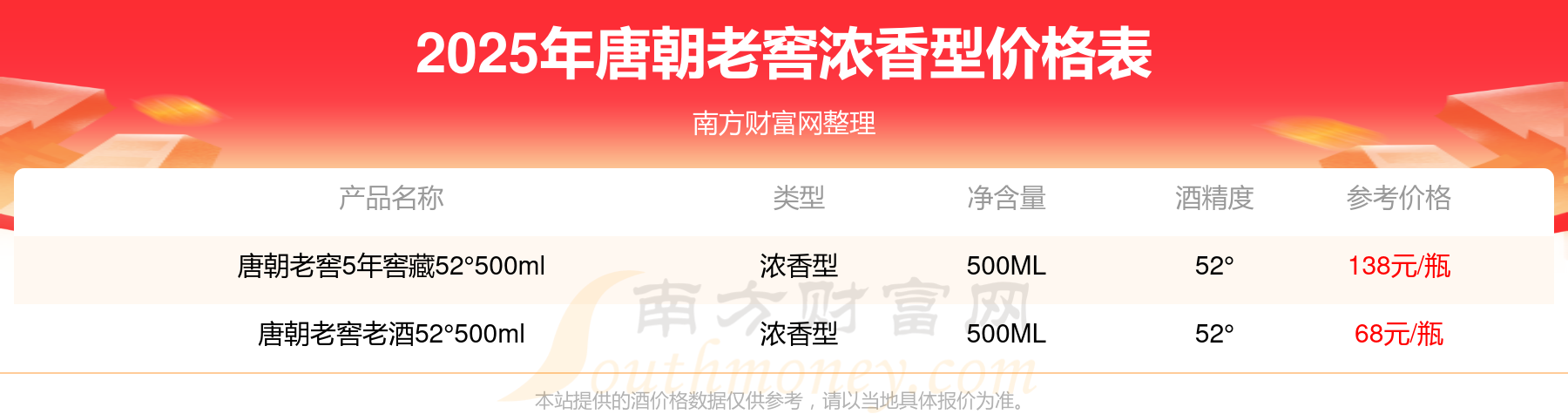 唐朝老窖濃香型酒最新價格2025:唐朝老窖5年窖藏52°500ml參考價138元/瓶、唐朝老窖老酒52°500ml參考價68元/瓶。