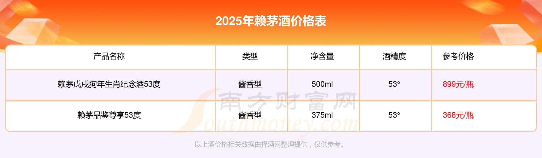 2025年,賴茅戊戌狗年生肖紀(jì)念酒53度、賴茅品鑒尊享53度等賴茅酒價格如下:賴茅戊戌狗年生肖紀(jì)念酒53度參考價899元/瓶、賴茅品鑒尊享53度參考價368元/瓶。