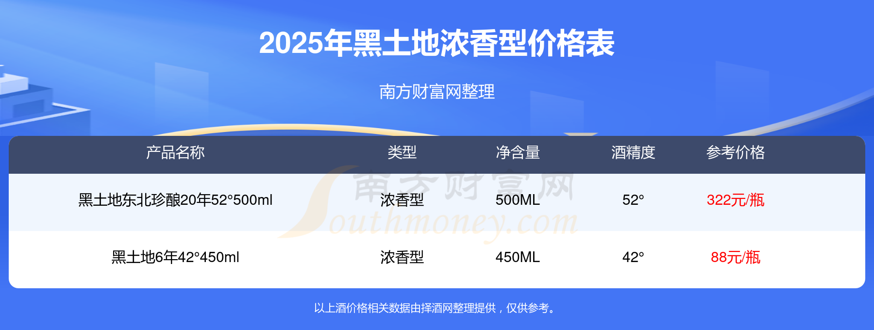 2025黑土地濃香型酒最新價(jià)格:黑土地東北珍釀20年52°500ml參考價(jià)322元/瓶、黑土地6年42°450ml參考價(jià)88元/瓶。