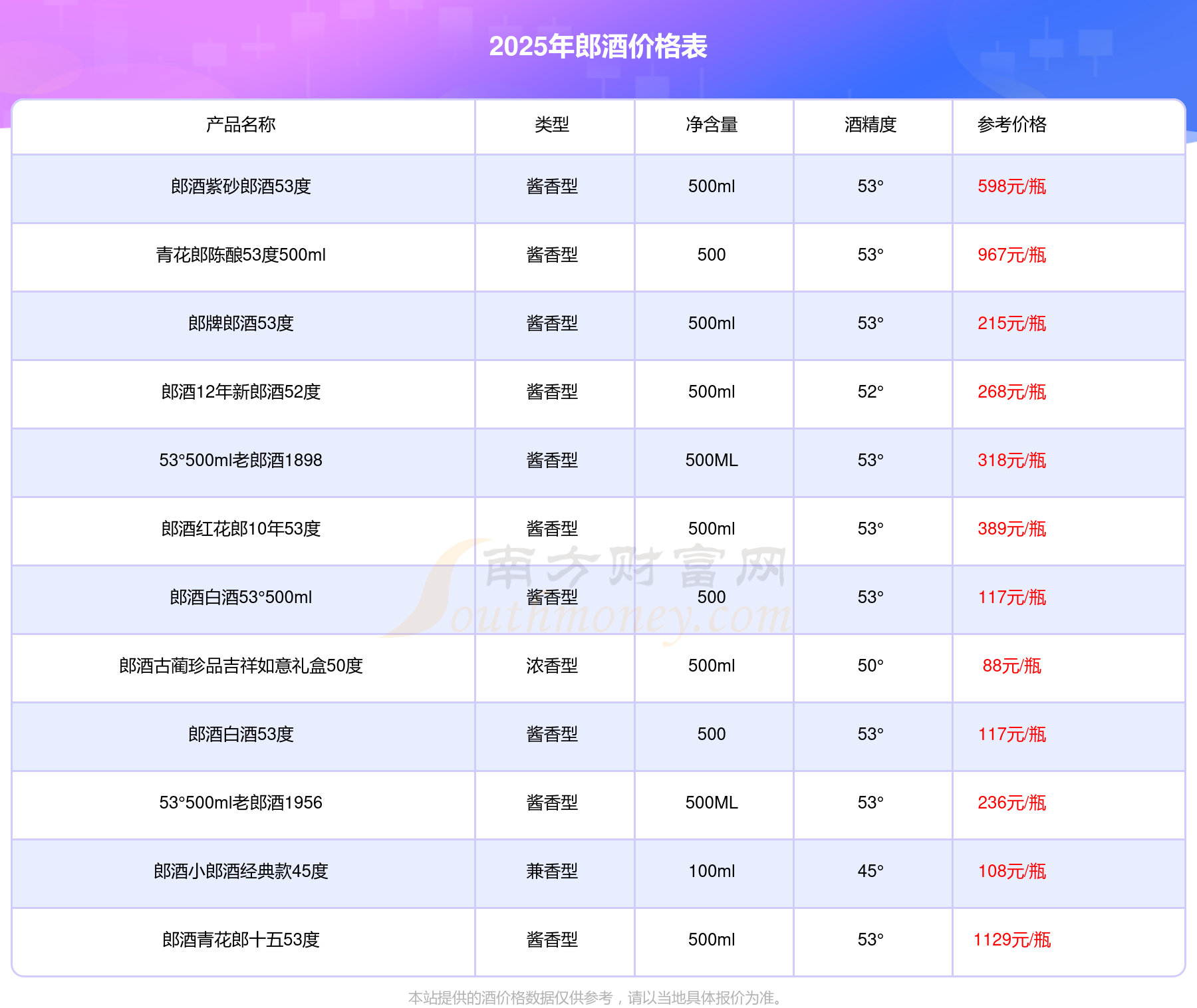 2025年,郎酒青花郎十五53度、青花郎陳釀53度500ml、郎酒紫砂郎酒53度等郎酒價(jià)格如下: