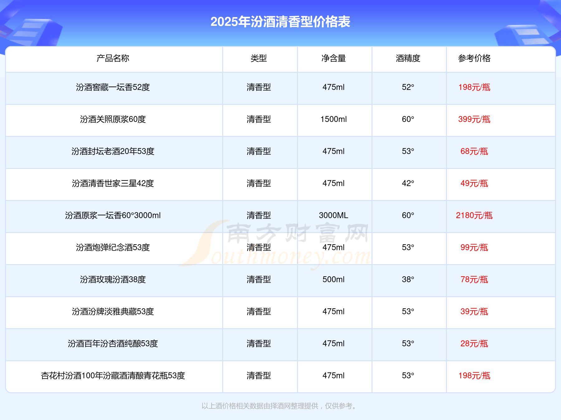 2025年,汾酒原漿一壇香60°3000ml、汾酒原漿一壇香60°1500ml、42度汾酒青花25等汾酒清香型酒價(jià)格如下: