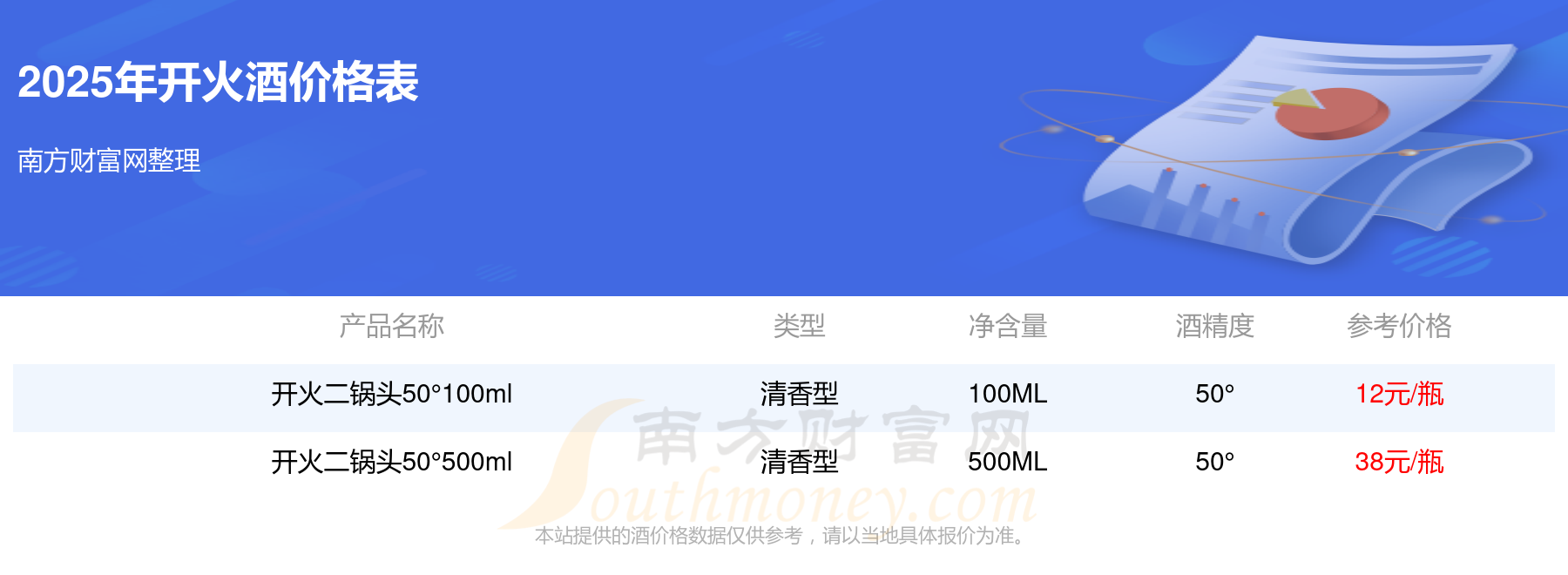 2025開火酒最新價格:開火二鍋頭50°500ml參考價38元/瓶、開火二鍋頭50°100ml參考價12元/瓶。