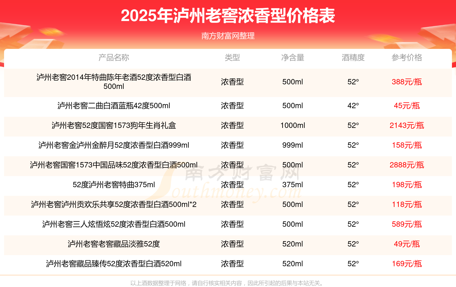 2025年瀘州老窖濃香型酒瀘州老窖國(guó)窖1573春釀鼠兆豐年E 55度、瀘州老窖國(guó)窖1573生命中的那壇酒55度014、瀘州老窖國(guó)窖1573春釀鼠兆豐年A 55度等最新價(jià)格如下:瀘州老窖國(guó)窖1573春釀鼠兆豐年E 55度參考價(jià)17999元/瓶、瀘州老窖國(guó)窖1573生命中的那壇酒55度014參考價(jià)9999元/瓶、瀘州老窖國(guó)窖1573春釀鼠兆豐年A 55度參考價(jià)5088元/瓶。