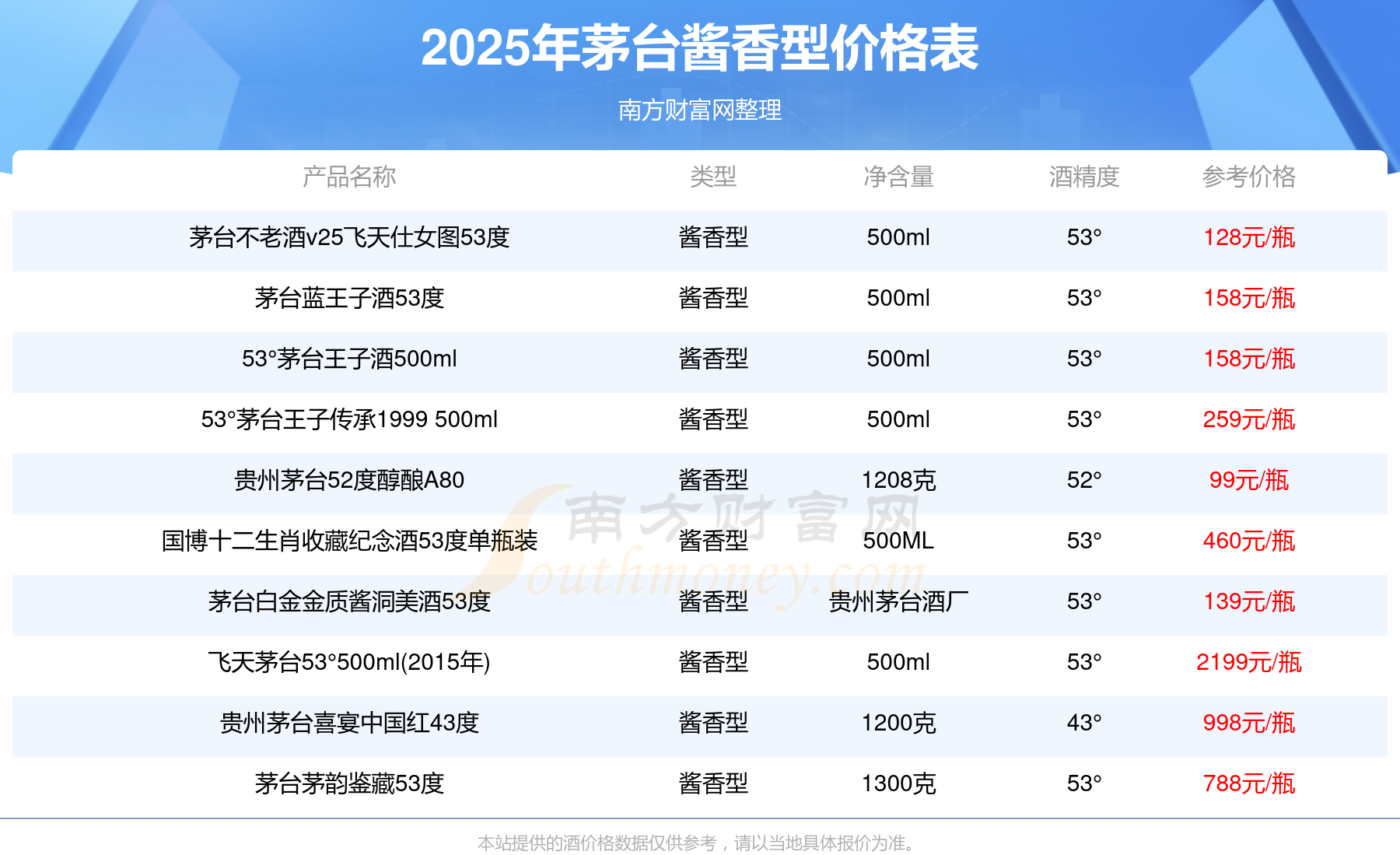 2025年茅臺醬香型酒華茅鑒藏 醬香型白酒 3L 53°、53度五星茅臺生肖酒丁酉雞年、貴州茅臺己亥豬年生肖酒53°500ml、53度五星茅臺生肖酒戊戌狗年、飛天茅臺53°500ml(2015年)等最新價格如下:華茅鑒藏 醬香型白酒 3L 53°參考價8388元/瓶、53度五星茅臺生肖酒丁酉雞年參考價2798元/瓶、貴州茅臺己亥豬年生肖酒53°500ml參考價2699元/瓶、53度五星茅臺生肖酒戊戌狗年參考價2698元/瓶、飛天茅臺53°500ml(2015年)參考價2199元/瓶。