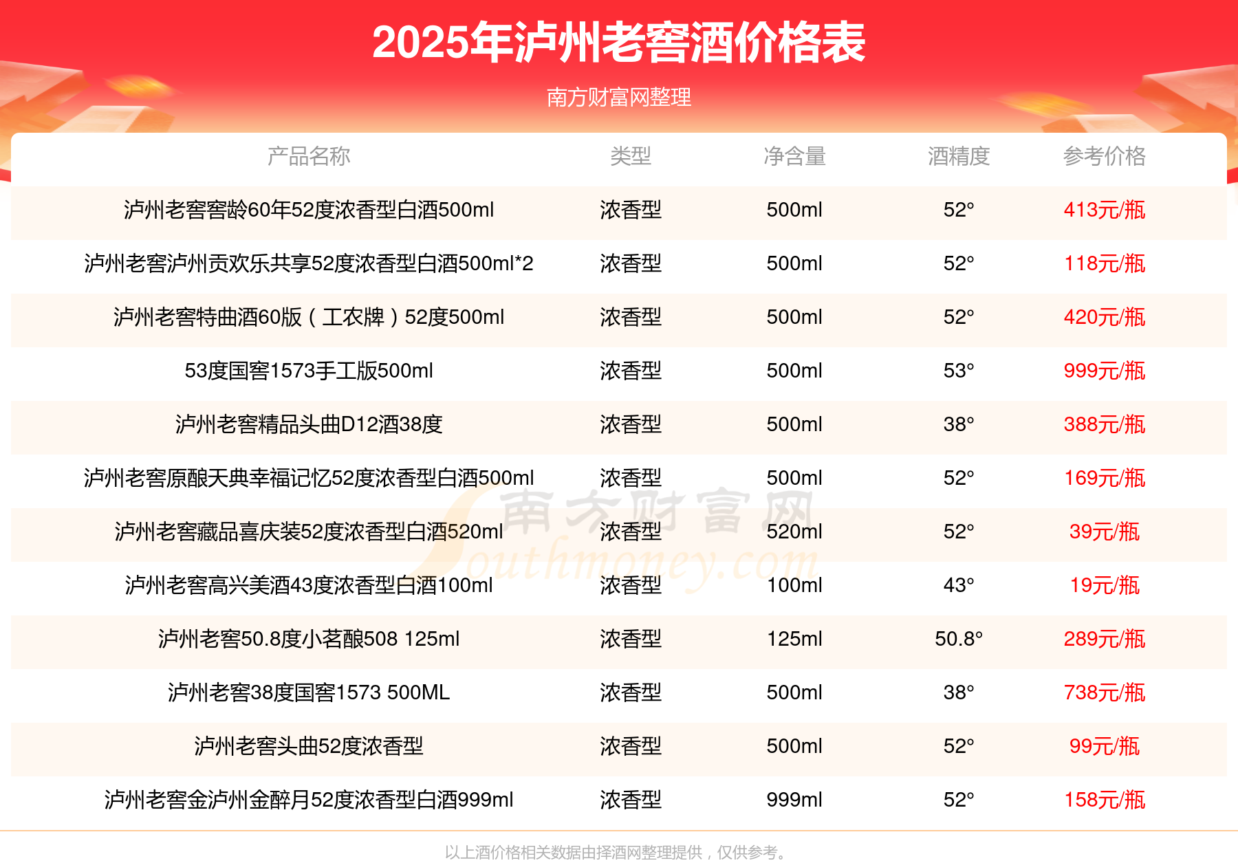 瀘州老窖酒最新價格2025:瀘州老窖國窖1573春釀鼠兆豐年E 55度參考價17999元/瓶、瀘州老窖國窖1573生命中的那壇酒55度014參考價9999元/瓶、瀘州老窖國窖1573春釀鼠兆豐年A 55度參考價5088元/瓶、瀘州老窖國窖1573生命中的那壇酒55度013濃香型白酒1000ml參考價4988元/瓶、瀘州老窖國窖1573生命中的那壇酒55度009 1000ml參考價4288元/瓶。