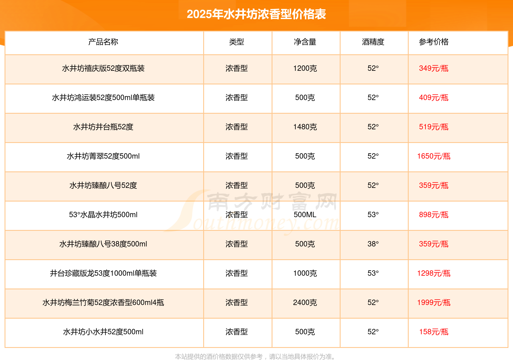 水井坊大壇收藏級原漿天球瓶66度參考價(jià)13999元/瓶、水井坊博物館壹號53度雙瓶裝參考價(jià)10988元/瓶、53°水井坊公元十三600ml參考價(jià)2580元/瓶、水井坊梅蘭竹菊52度濃香型600ml4瓶參考價(jià)1999元/瓶、水井坊菁翠52度500ml參考價(jià)1650元/瓶。