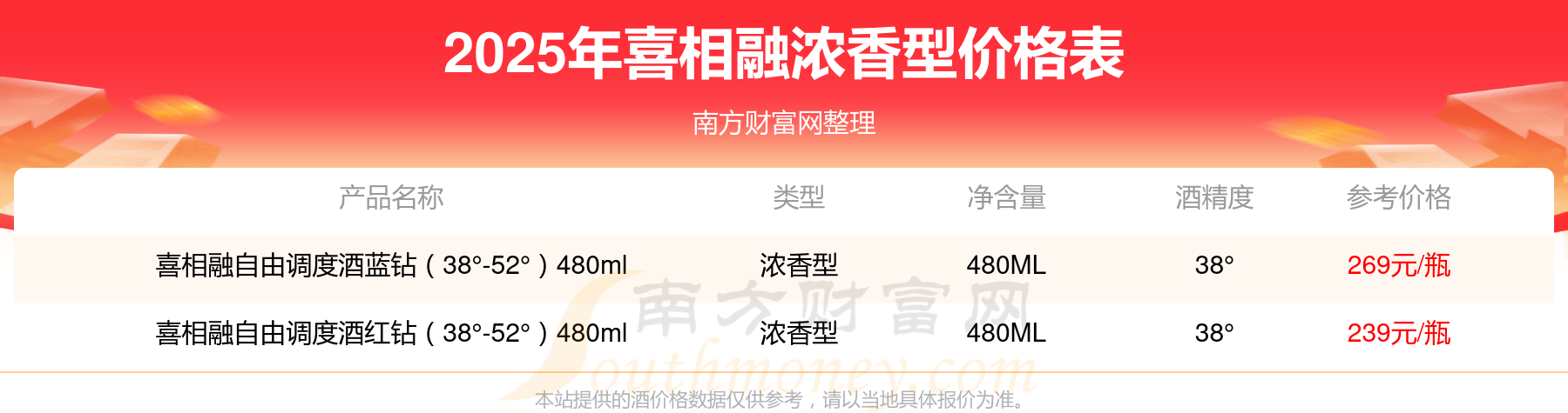 2025年喜相融濃香型酒喜相融自由調(diào)度酒藍鉆(38°-52°)480ml、喜相融自由調(diào)度酒紅鉆(38°-52°)480ml等最新價格如下:喜相融自由調(diào)度酒藍鉆(38°-52°)480ml參考價269元/瓶、喜相融自由調(diào)度酒紅鉆(38°-52°)480ml參考價239元/瓶。