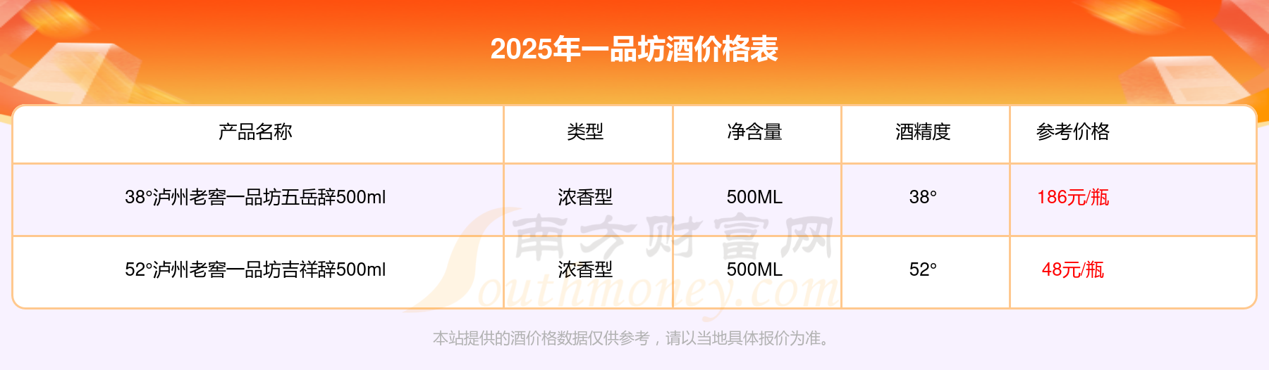 一品坊酒最新價(jià)格2025:38°瀘州老窖一品坊五岳辭500ml參考價(jià)186元/瓶、52°瀘州老窖一品坊吉祥辭500ml參考價(jià)48元/瓶。