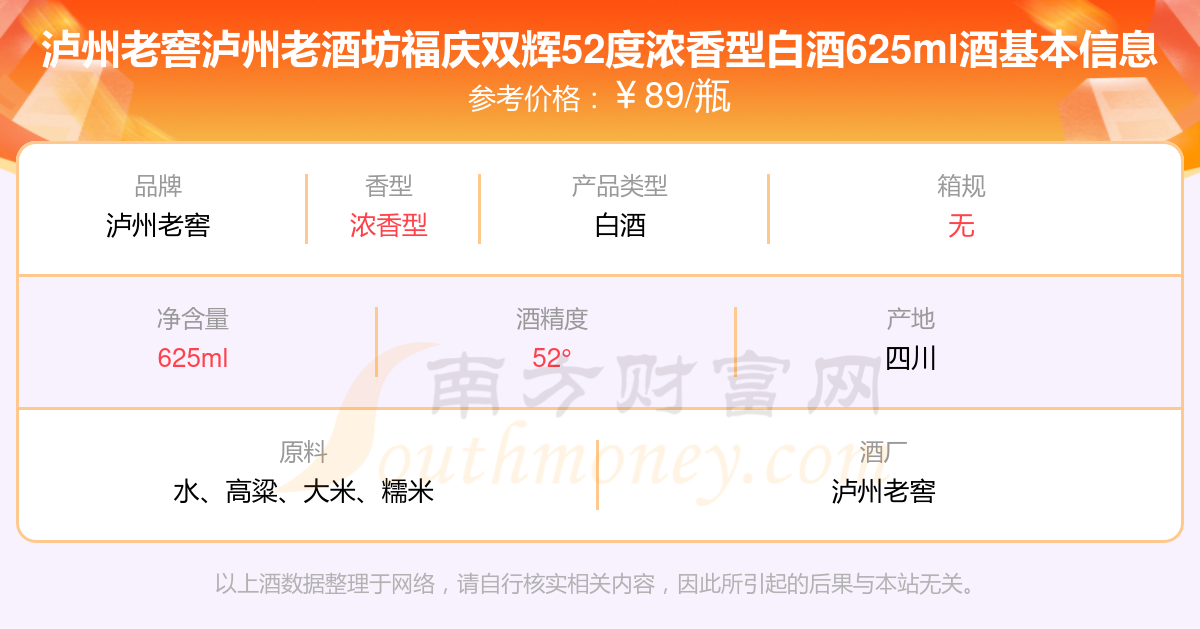 瀘州老窖瀘州老酒坊福慶雙輝52度濃香型白酒625ml基本信息