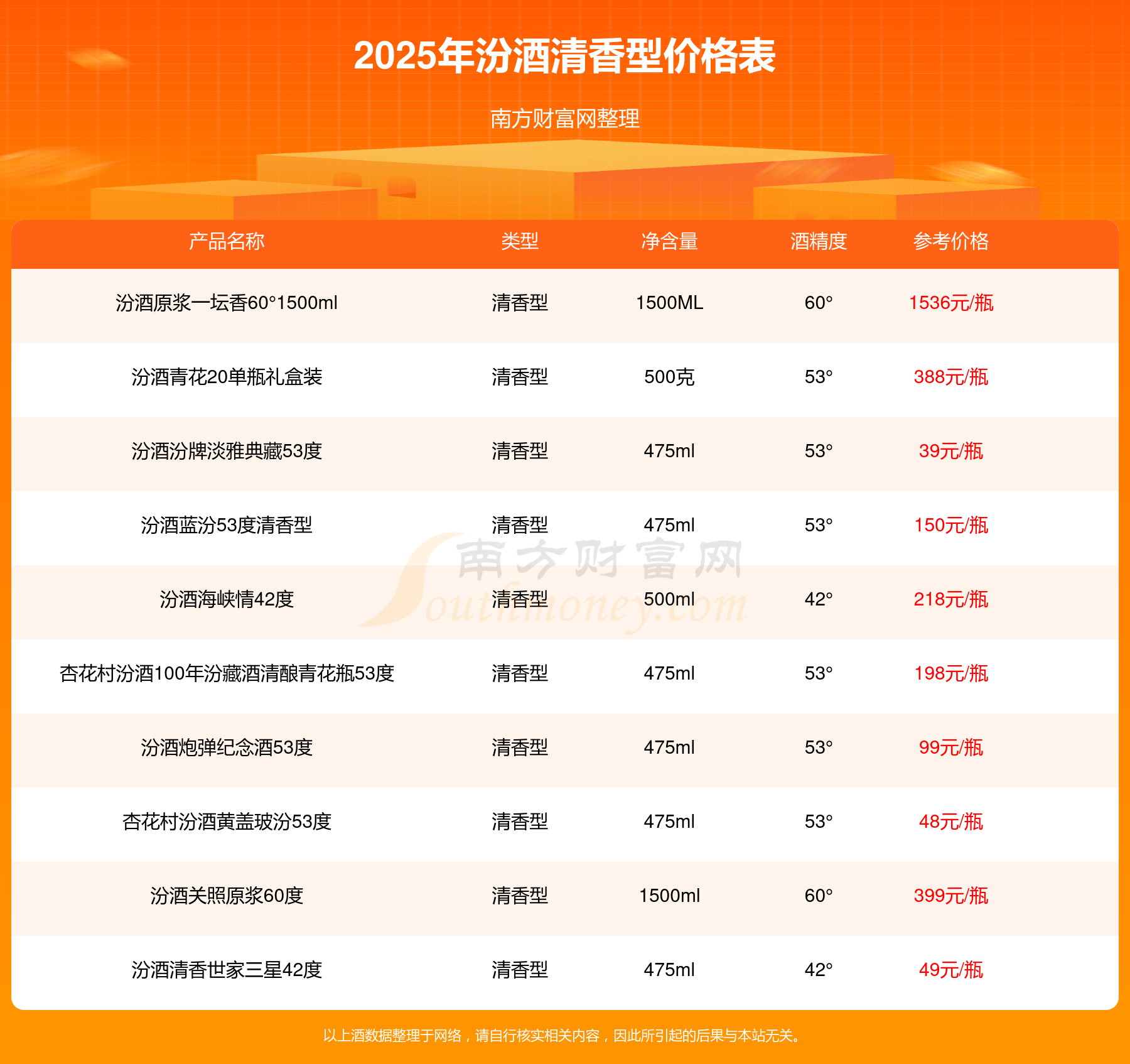 汾酒清香型酒最新價格2025:汾酒原漿一壇香60°3000ml參考價2180元/瓶、汾酒原漿一壇香60°1500ml參考價1536元/瓶、42度汾酒青花25參考價598元/瓶、汾酒收藏系列盤古汾酒55度參考價400元/瓶、汾酒關照原漿60度參考價399元/瓶、汾酒青花20單瓶禮盒裝參考價388元/瓶。