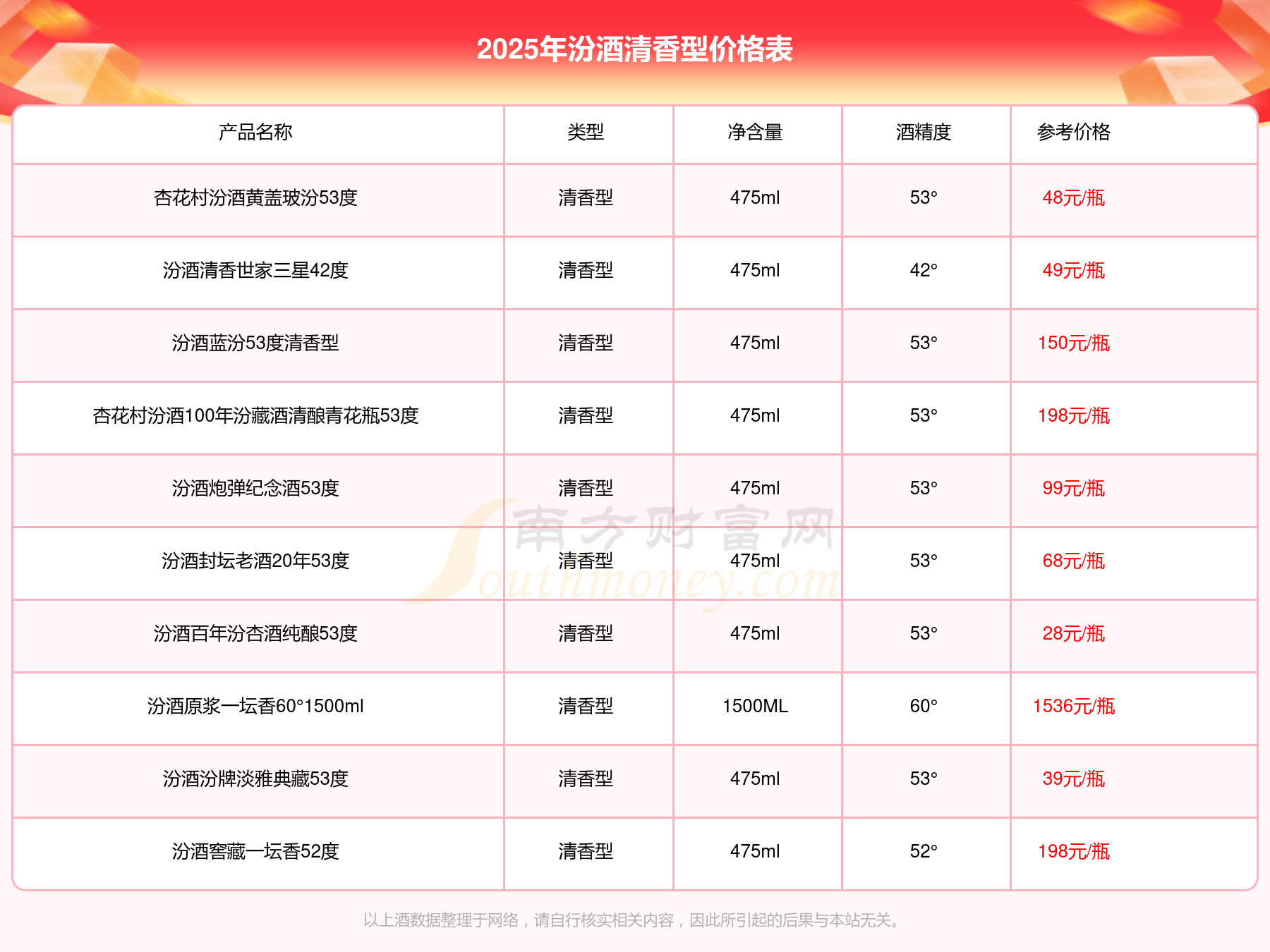 2025年汾酒清香型酒汾酒原漿一壇香60°3000ml、汾酒原漿一壇香60°1500ml、42度汾酒青花25、汾酒收藏系列盤古汾酒55度、汾酒關照原漿60度、汾酒青花20單瓶禮盒裝等最新價格如下: