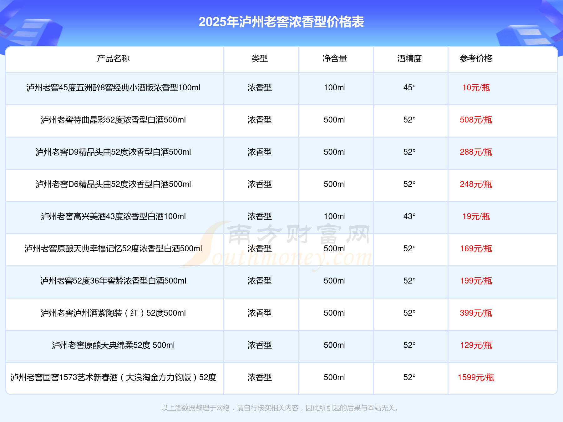 2025年,瀘州老窖國窖1573春釀鼠兆豐年E 55度、瀘州老窖國窖1573生命中的那壇酒55度014、瀘州老窖國窖1573春釀鼠兆豐年A 55度、瀘州老窖國窖1573生命中的那壇酒55度013濃香型白酒1000ml、瀘州老窖國窖1573生命中的那壇酒55度009 1000ml等瀘州老窖濃香型酒價格如下:瀘州老窖國窖1573春釀鼠兆豐年E 55度參考價17999元/瓶、瀘州老窖國窖1573生命中的那壇酒55度014參考價9999元/瓶、瀘州老窖國窖1573春釀鼠兆豐年A 55度參考價5088元/瓶、瀘州老窖國窖1573生命中的那壇酒55度013濃香型白酒1000ml參考價4988元/瓶、瀘州老窖國窖1573生命中的那壇酒55度009 1000ml參考價4288元/瓶。