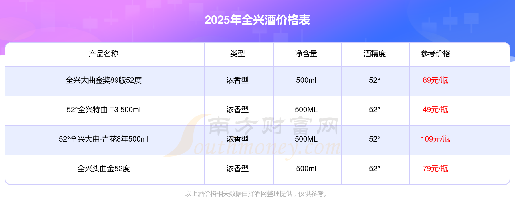 2025年,52°全興大曲·青花8年500ml、全興大曲金獎89版52度、全興頭曲金52度等全興酒價格如下: