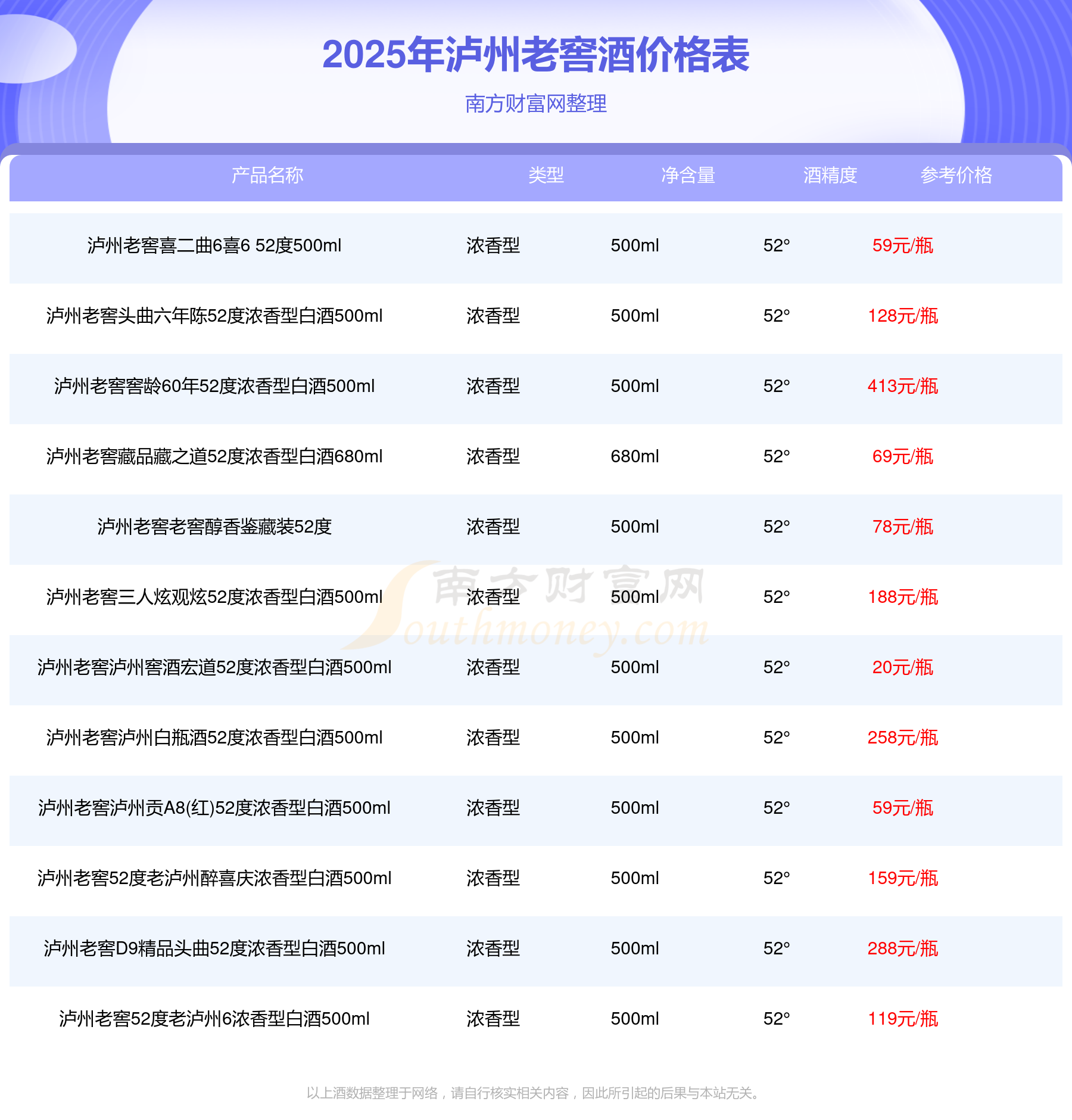 2025年,瀘州老窖國窖1573春釀鼠兆豐年E 55度、瀘州老窖國窖1573生命中的那壇酒55度014、瀘州老窖國窖1573春釀鼠兆豐年A 55度、瀘州老窖國窖1573生命中的那壇酒55度013濃香型白酒1000ml、瀘州老窖國窖1573生命中的那壇酒55度009 1000ml、瀘州老窖國窖1573中國品味52度濃香型白酒500ml、瀘州老窖國窖1573許燎源概念作品58度濃香型白酒1000ml等瀘州老窖酒參考價格如下:瀘州老窖國窖1573春釀鼠兆豐年E 55度參考價17999元、瀘州老窖國窖1573生命中的那壇酒55度014參考價9999元、瀘州老窖國窖1573春釀鼠兆豐年A 55度參考價5088元、瀘州老窖國窖1573生命中的那壇酒55度013濃香型白酒1000ml參考價4988元、瀘州老窖國窖1573生命中的那壇酒55度009 1000ml參考價4288元、瀘州老窖國窖1573中國品味52度濃香型白酒500ml參考價2888元、瀘州老窖國窖1573許燎源概念作品58度濃香型白酒1000ml參考價2680元。