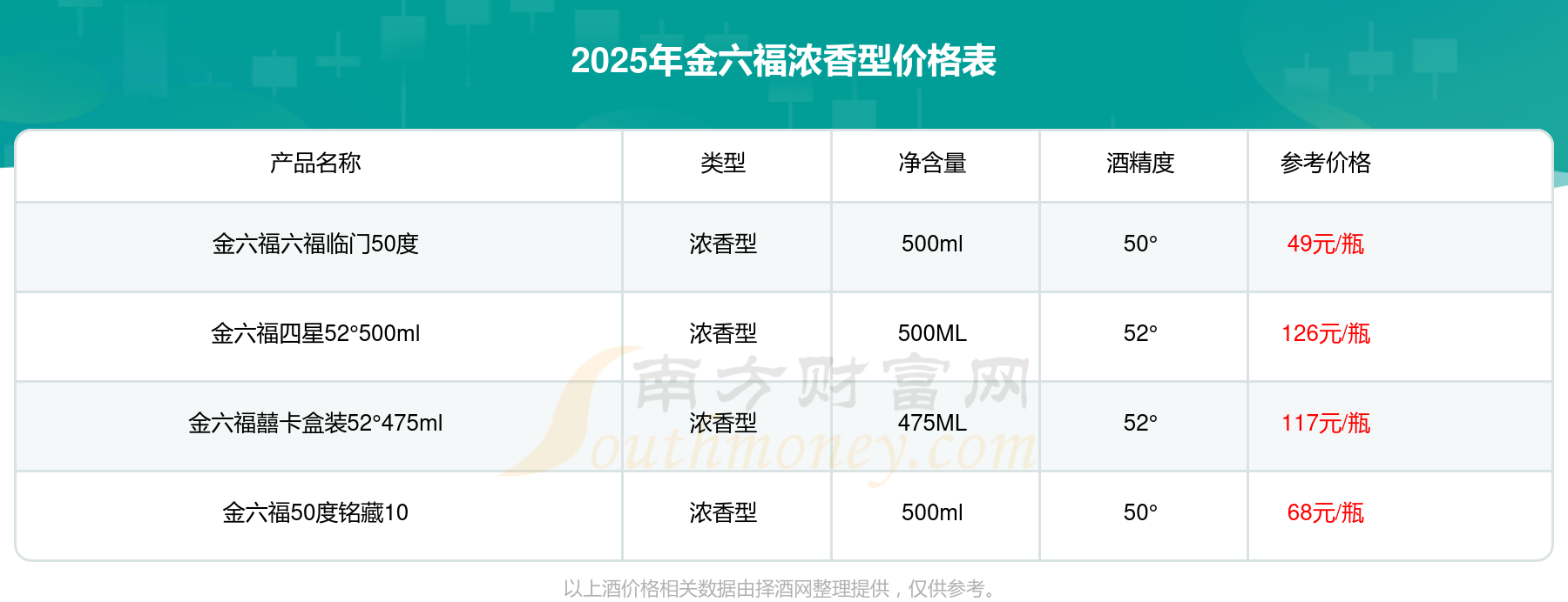 2025年金六福濃香型酒金六福四星52°500ml、金六福囍卡盒裝52°475ml、金六福50度銘藏10、金六福六福臨門50度等最新價(jià)格如下:金六福四星52°500ml參考價(jià)126元/瓶、金六福囍卡盒裝52°475ml參考價(jià)117元/瓶、金六福50度銘藏10參考價(jià)68元/瓶、金六福六福臨門50度參考價(jià)49元/瓶。