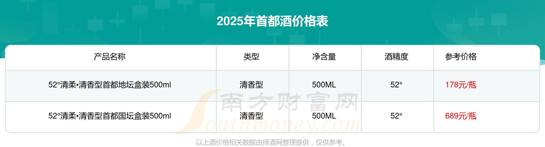 2025年首都酒52°清柔?清香型首都國壇盒裝500ml、52°清柔?清香型首都地壇盒裝500ml等最新價格如下: