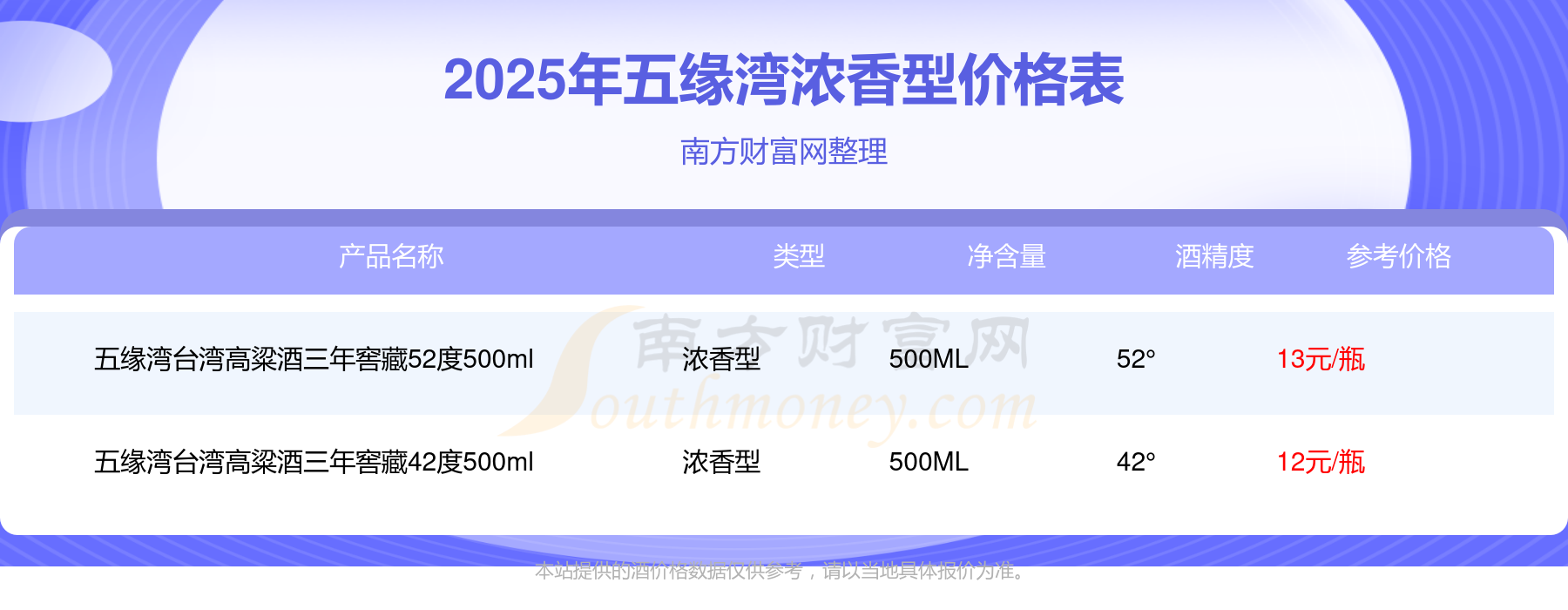 2025年五緣灣濃香型酒五緣灣臺(tái)灣高粱酒三年窖藏52度500ml、五緣灣臺(tái)灣高粱酒三年窖藏42度500ml等最新價(jià)格如下:五緣灣臺(tái)灣高粱酒三年窖藏52度500ml參考價(jià)13元/瓶、五緣灣臺(tái)灣高粱酒三年窖藏42度500ml參考價(jià)12元/瓶。
