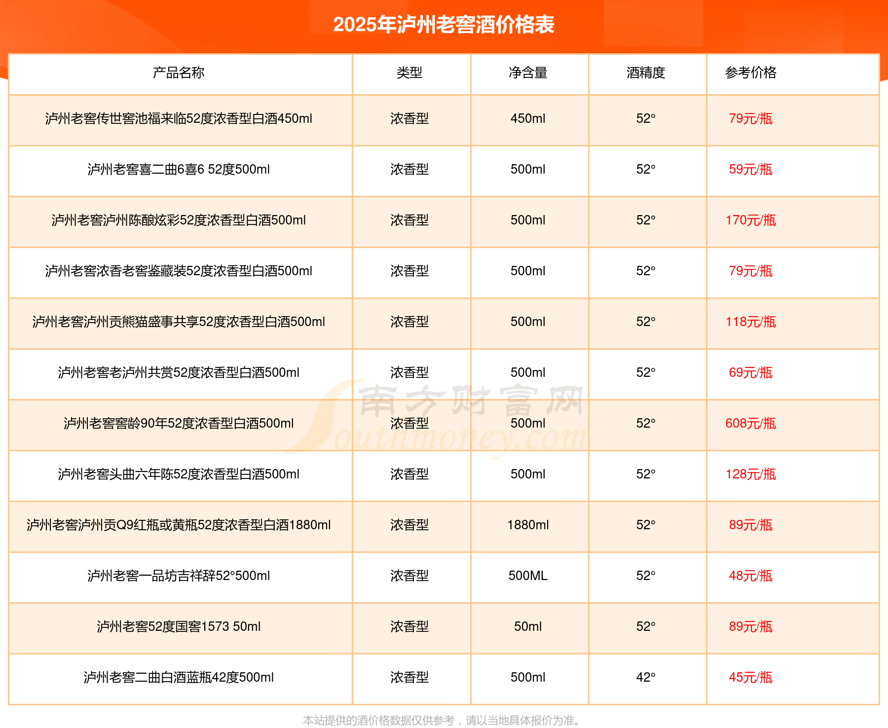 瀘州老窖酒最新價(jià)格2025:瀘州老窖國(guó)窖1573春釀鼠兆豐年E 55度參考價(jià)17999元/瓶、瀘州老窖國(guó)窖1573生命中的那壇酒55度014參考價(jià)9999元/瓶、瀘州老窖國(guó)窖1573春釀鼠兆豐年A 55度參考價(jià)5088元/瓶、瀘州老窖國(guó)窖1573生命中的那壇酒55度013濃香型白酒1000ml參考價(jià)4988元/瓶、瀘州老窖國(guó)窖1573生命中的那壇酒55度009 1000ml參考價(jià)4288元/瓶、瀘州老窖國(guó)窖1573中國(guó)品味52度濃香型白酒500ml參考價(jià)2888元/瓶。