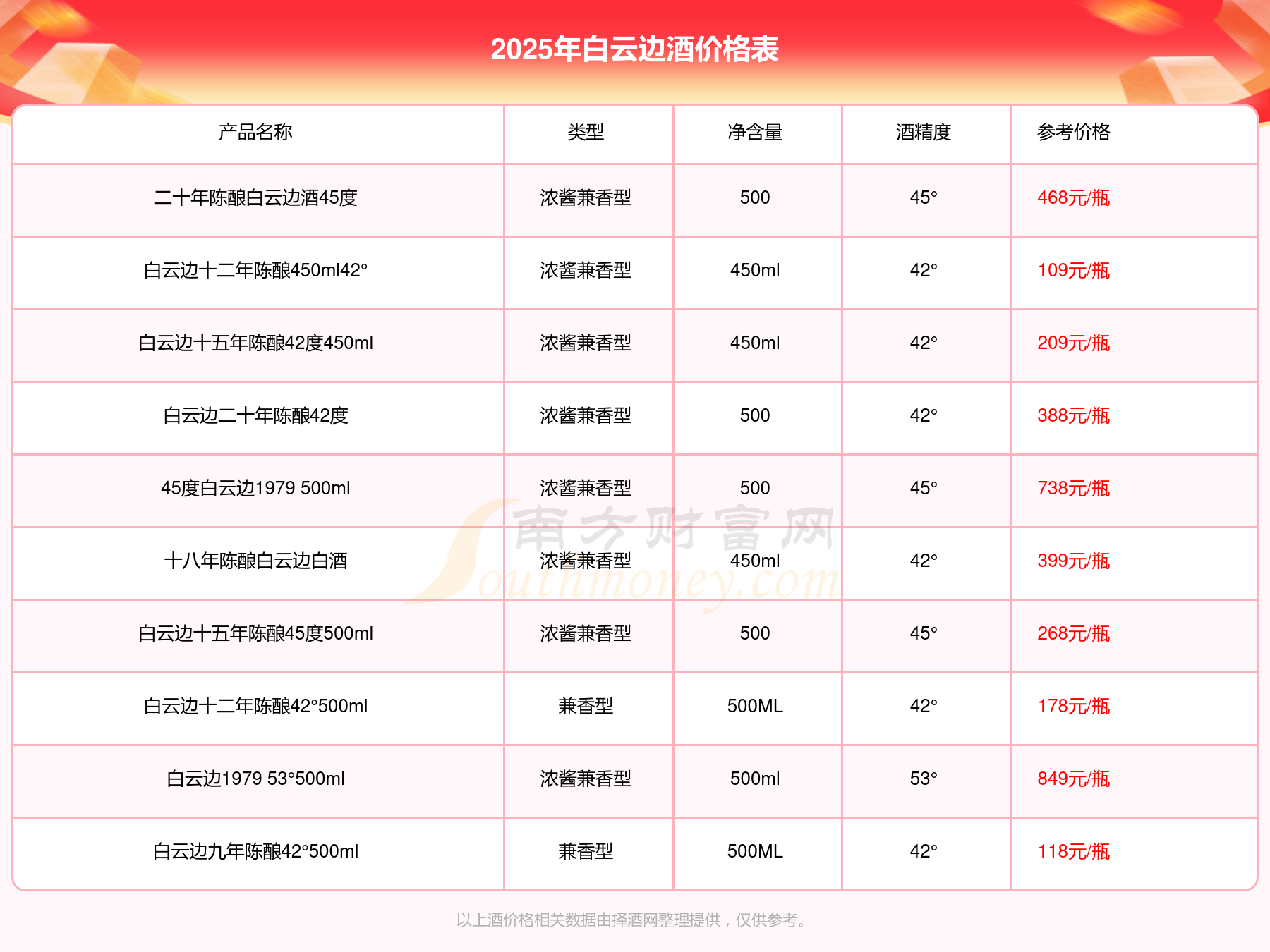 2025白云邊酒最新價格:白云邊1979 53°500ml參考價849元/瓶、45度白云邊1979 500ml參考價738元/瓶、二十年陳釀白云邊酒45度參考價468元/瓶。