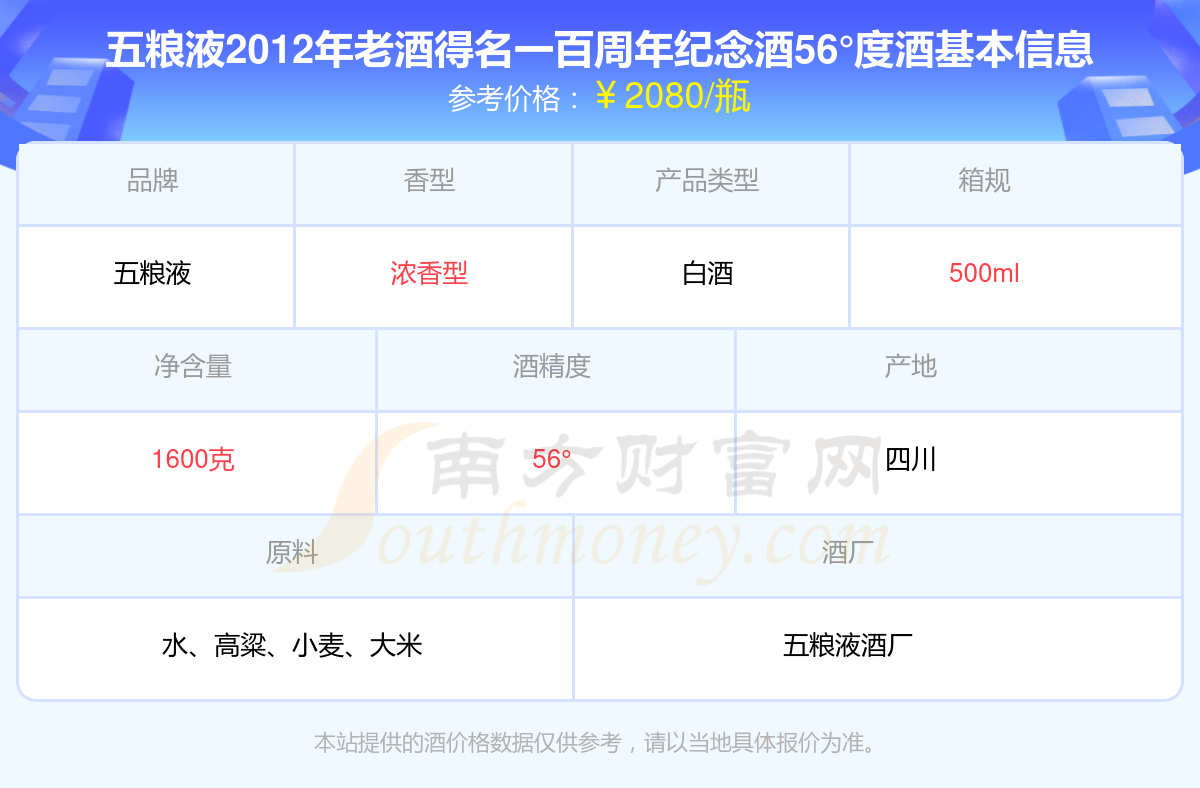 五糧液2012年老酒得名一百周年紀(jì)念酒56°度基本信息
