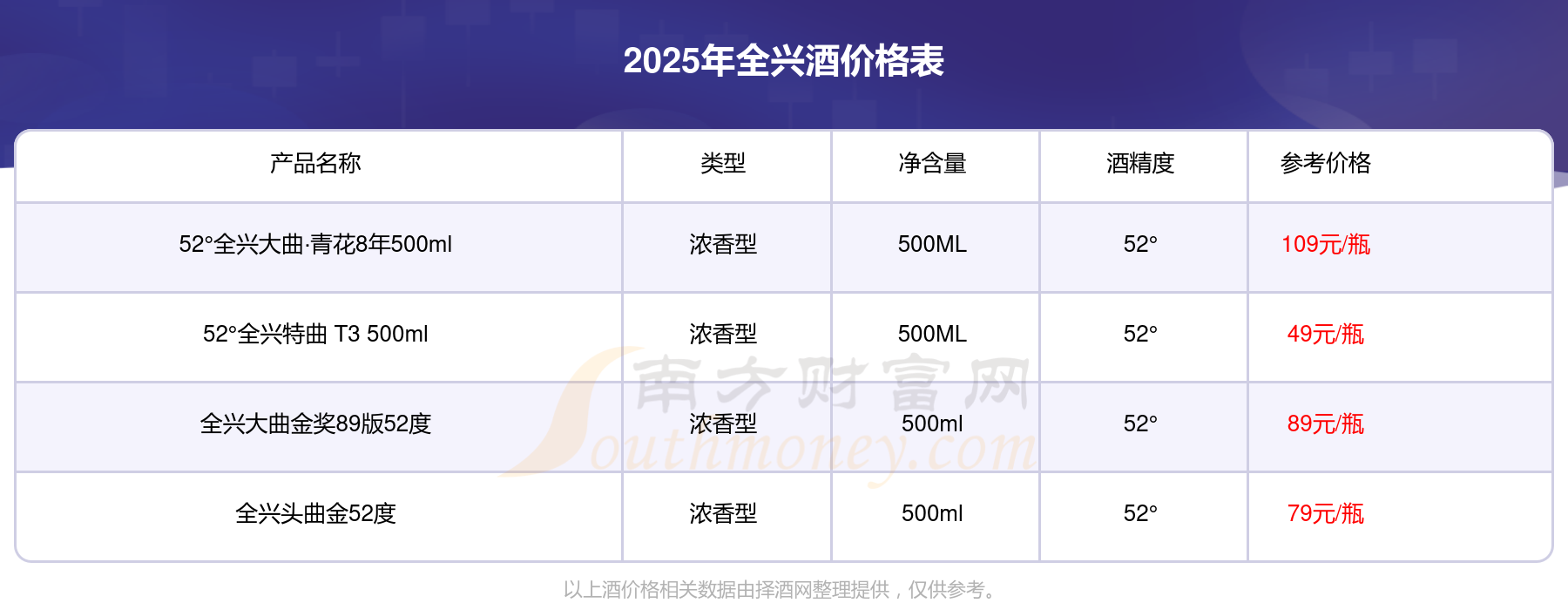 52°全興大曲·青花8年500ml參考價(jià)109元/瓶、全興大曲金獎(jiǎng)89版52度參考價(jià)89元/瓶、全興頭曲金52度參考價(jià)79元/瓶、52°全興特曲 T3 500ml參考價(jià)49元/瓶。