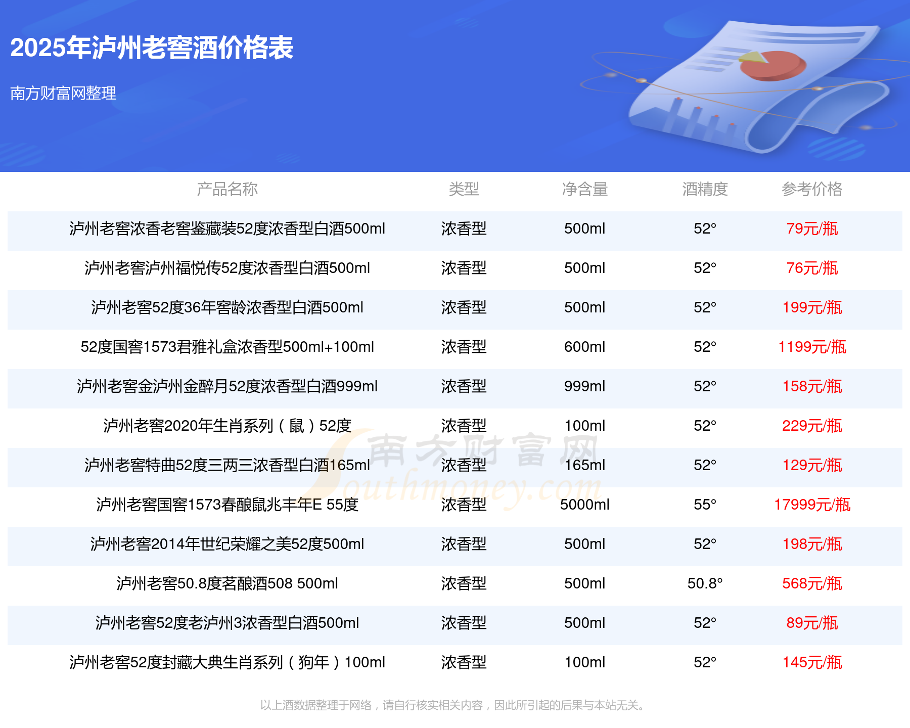 2025瀘州老窖酒最新價(jià)格:瀘州老窖國窖1573春釀鼠兆豐年E 55度參考價(jià)17999元/瓶、瀘州老窖國窖1573生命中的那壇酒55度014參考價(jià)9999元/瓶、瀘州老窖國窖1573春釀鼠兆豐年A 55度參考價(jià)5088元/瓶、瀘州老窖國窖1573生命中的那壇酒55度013濃香型白酒1000ml參考價(jià)4988元/瓶、瀘州老窖國窖1573生命中的那壇酒55度009 1000ml參考價(jià)4288元/瓶、瀘州老窖國窖1573中國品味52度濃香型白酒500ml參考價(jià)2888元/瓶。
