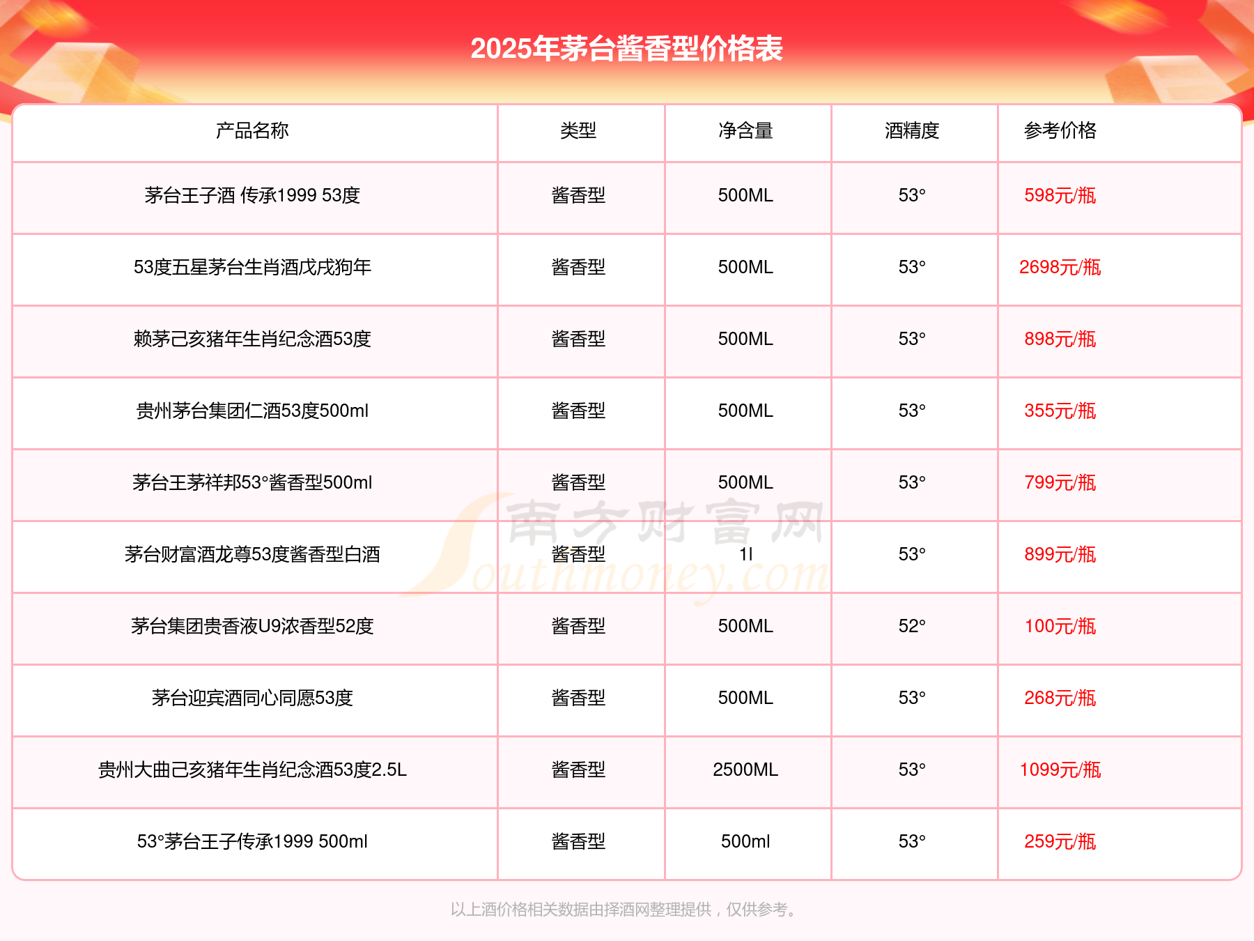 2025茅臺醬香型酒最新價(jià)格:華茅鑒藏 醬香型白酒 3L 53°參考價(jià)8388元/瓶、53度五星茅臺生肖酒丁酉雞年參考價(jià)2798元/瓶、貴州茅臺己亥豬年生肖酒53°500ml參考價(jià)2699元/瓶、53度五星茅臺生肖酒戊戌狗年參考價(jià)2698元/瓶、飛天茅臺53°500ml(2015年)參考價(jià)2199元/瓶、茅臺王子酒己亥豬年生肖紀(jì)念酒53度2.5L參考價(jià)2099元/瓶、茅臺1935醬香型53度參考價(jià)1799元/瓶。