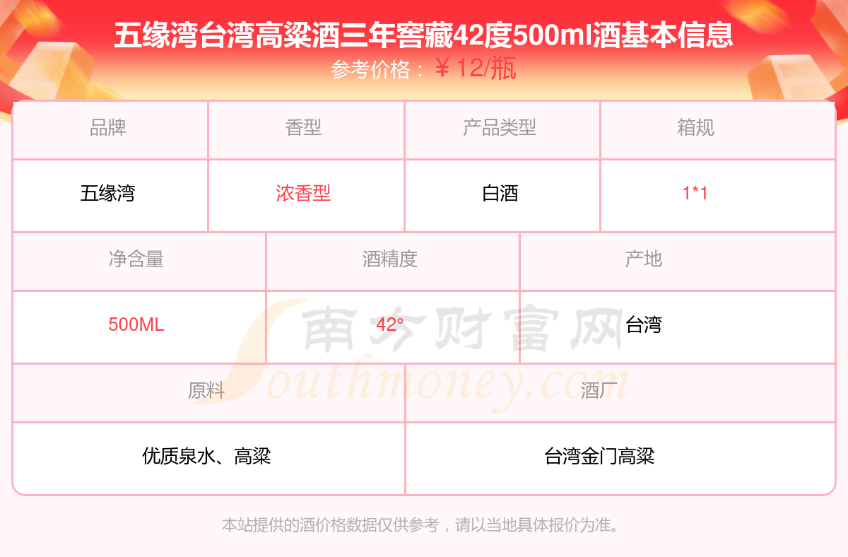 五緣灣臺灣高粱酒三年窖藏42度500ml基本信息