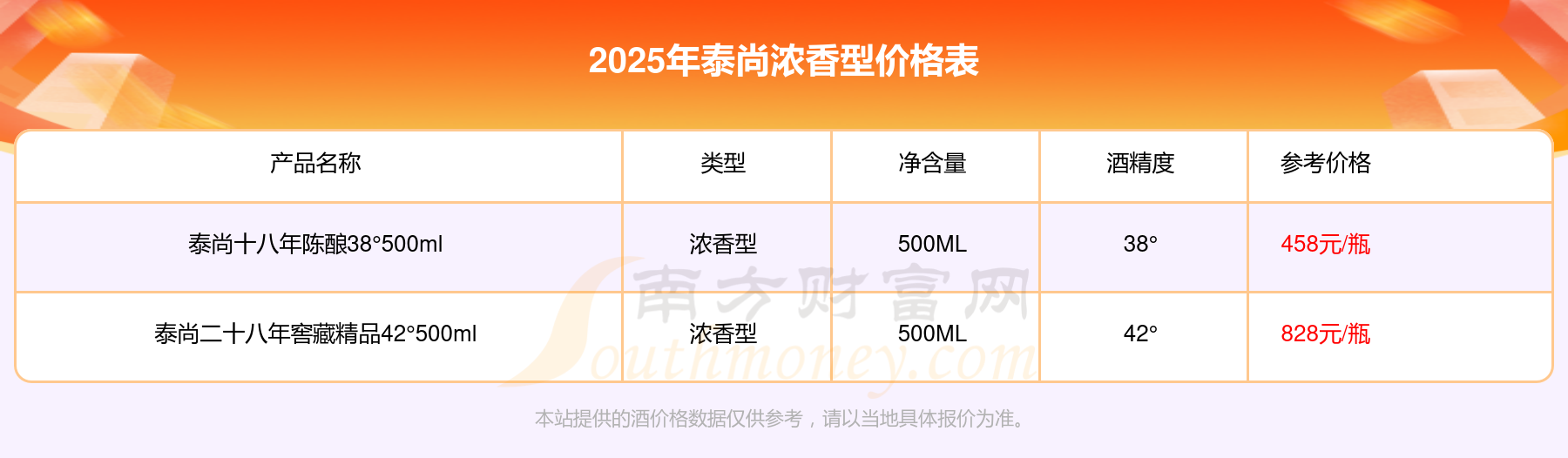 泰尚二十八年窖藏精品42°500ml參考價(jià)828元/瓶、泰尚十八年陳釀38°500ml參考價(jià)458元/瓶。
