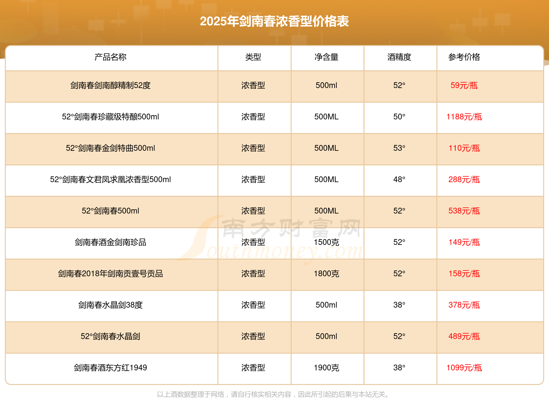 劍南春濃香型酒最新價格2025:劍南春鑒藏52度參考價1199元/瓶、52°劍南春珍藏級特釀500ml參考價1188元/瓶、劍南春酒東方紅1949參考價1099元/瓶。
